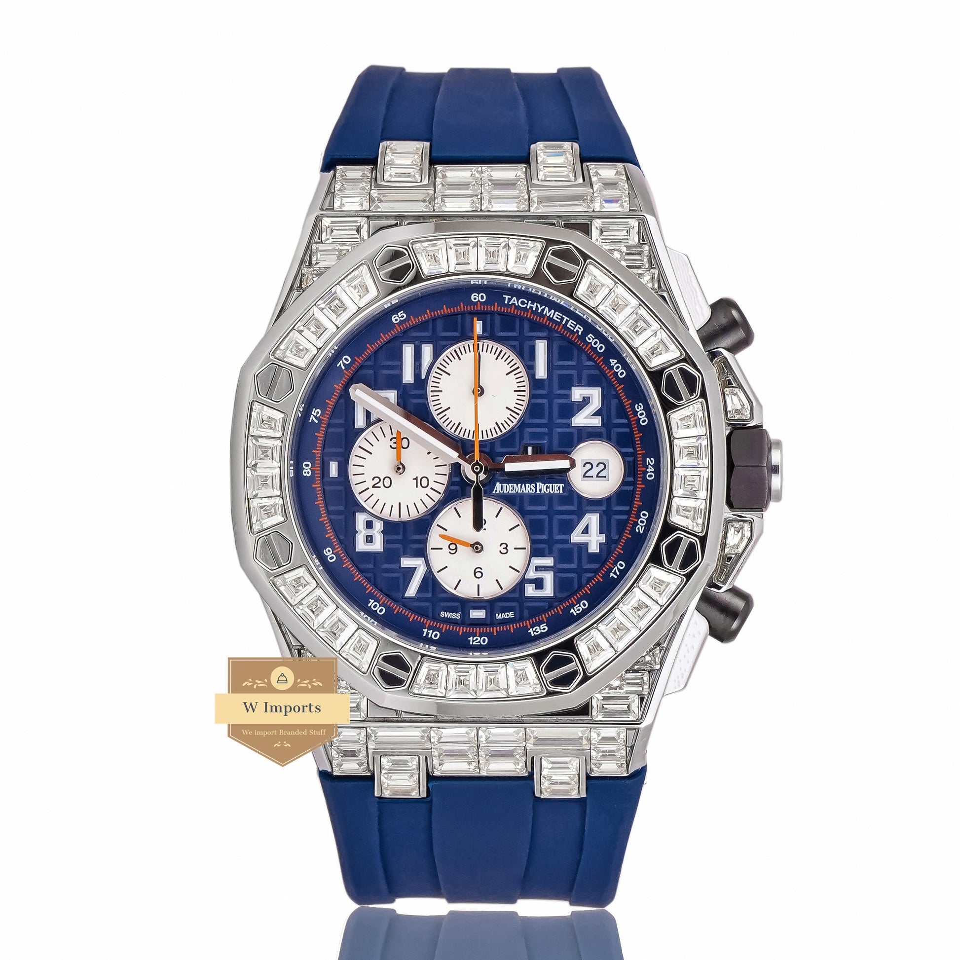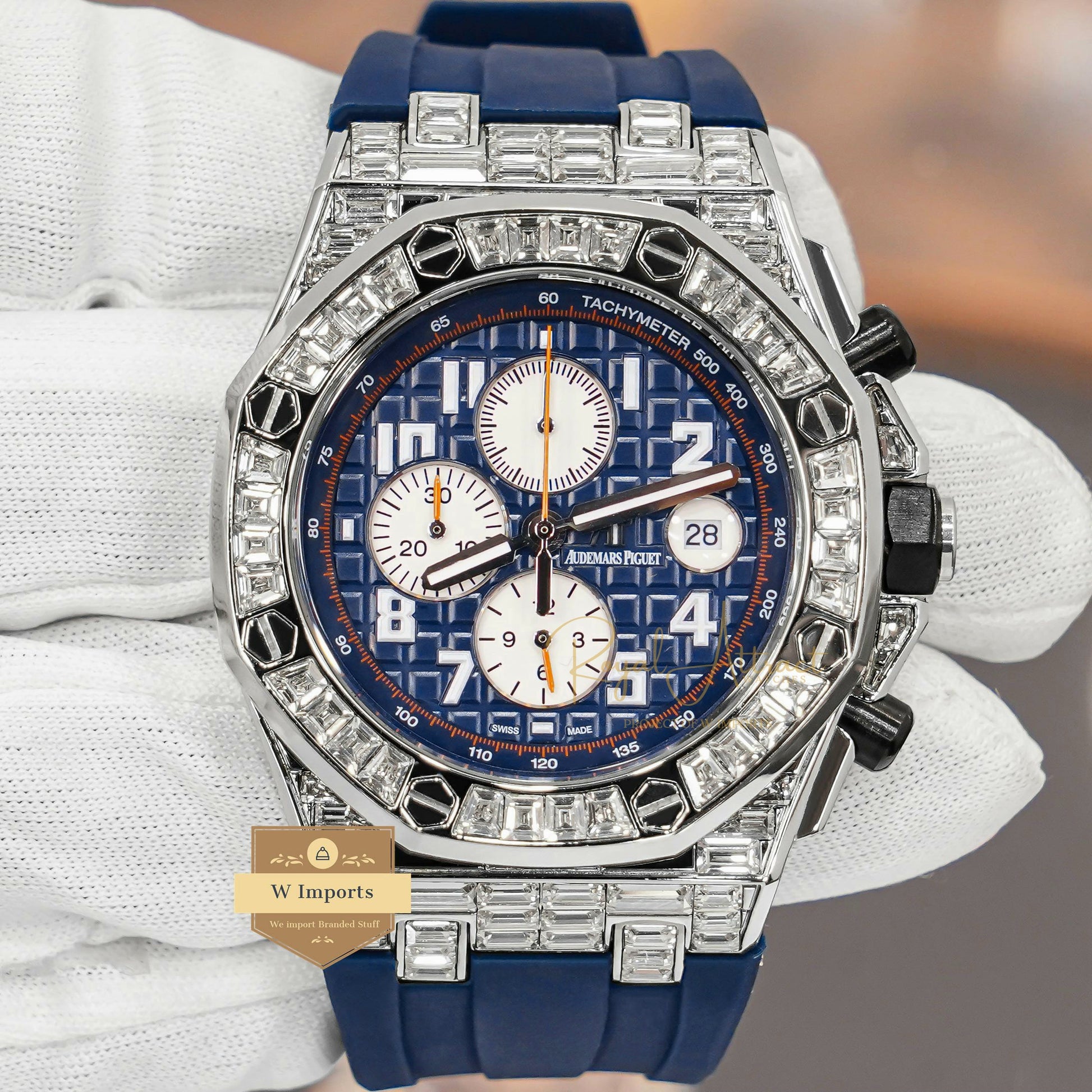 LATEST COLLECTION CHRONOGRAPH SILVER STONE BEZEL WITH BLUE DIAL & RUBBER STRAP
