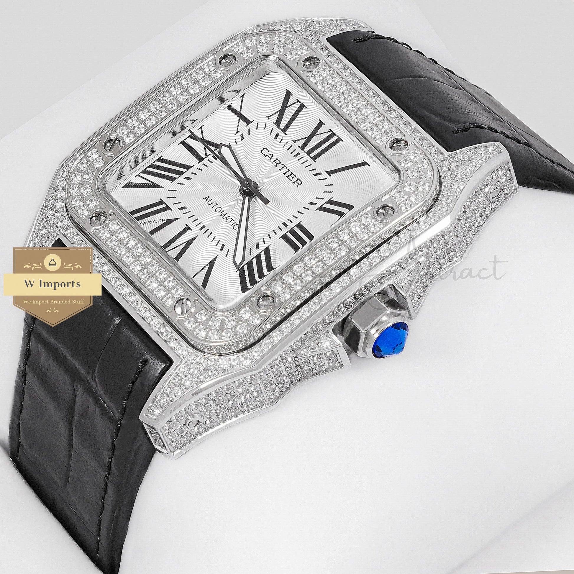 LATEST COLLECTION SILVER STONE CASE WITH WHITE DIAL & BLACK LEATHER STRAP