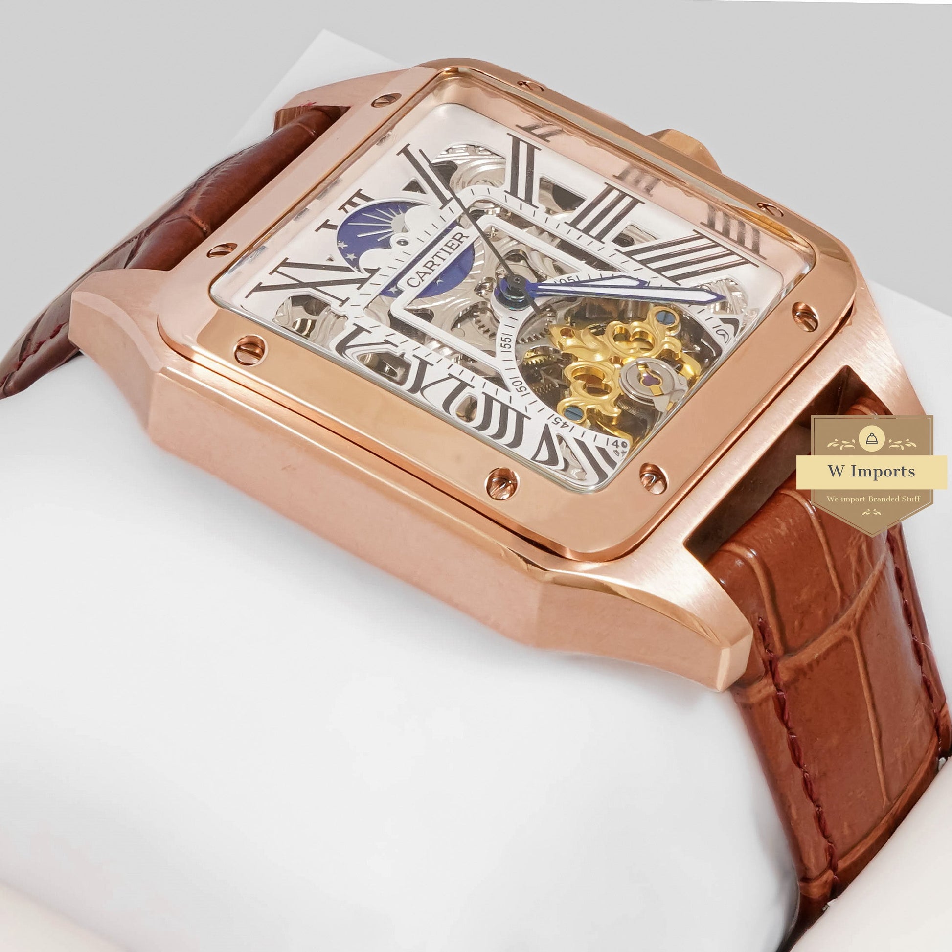 LATEST COLLECTION TOURBILLON MOON PHASE ROSE GOLD CASE WITH WHITE SKELETON DIAL & BROWN LEATHER STRAP