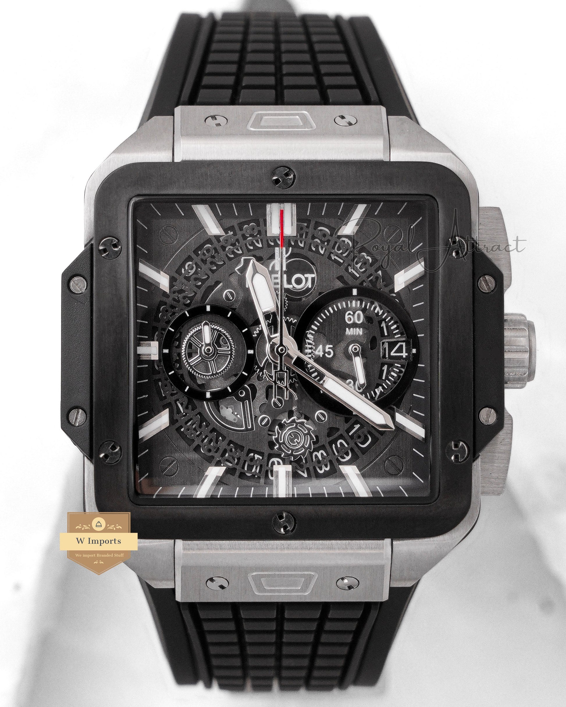 LATEST COLLECTION CHRONOGRAPH SQUARE SILVER CASE WITH GREY SKELETON DIAL & BLACK PVC STRAP