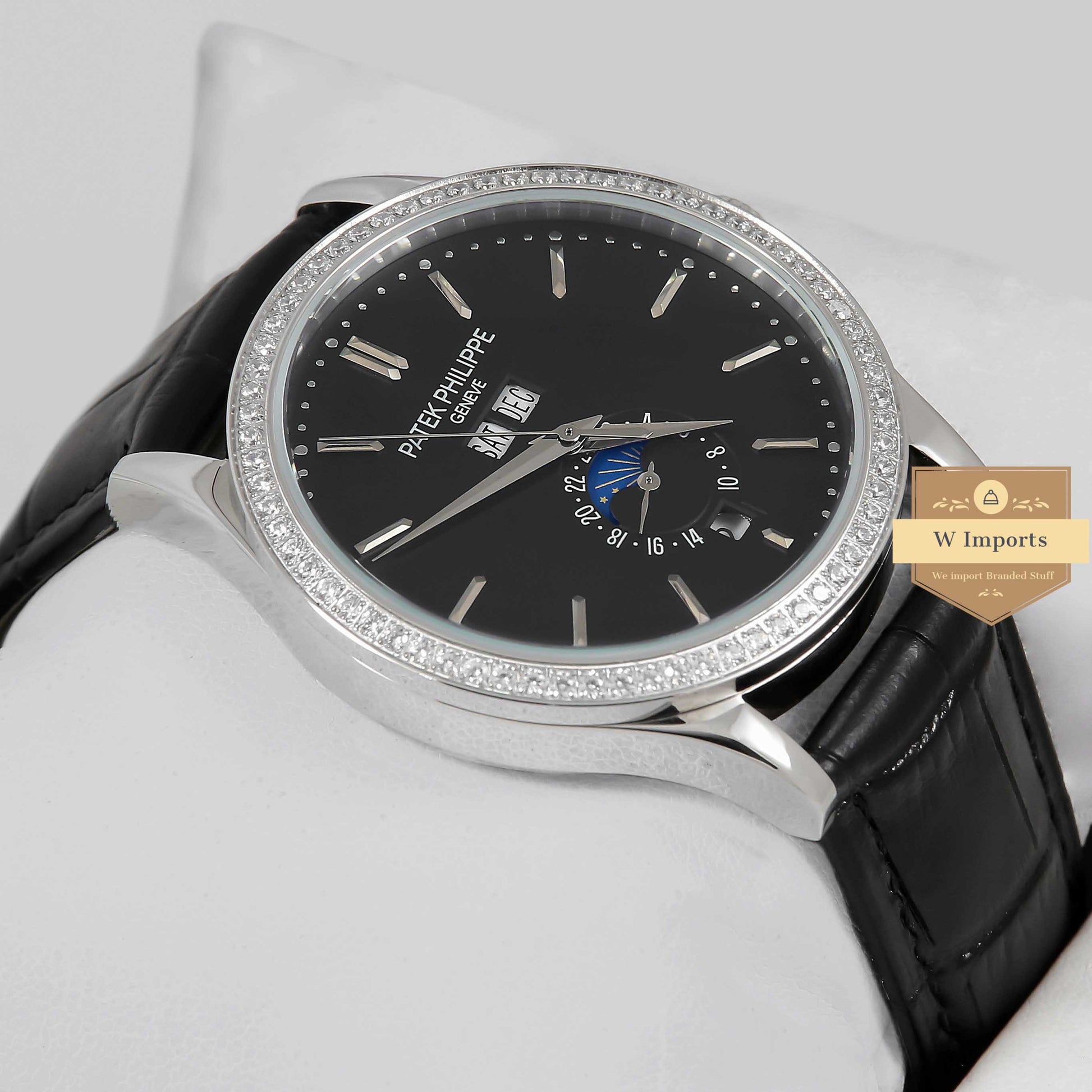 Latest Collection Annual Calendar Moon phase Silver Case With Black Dial Stone Bezel & Leather Strap