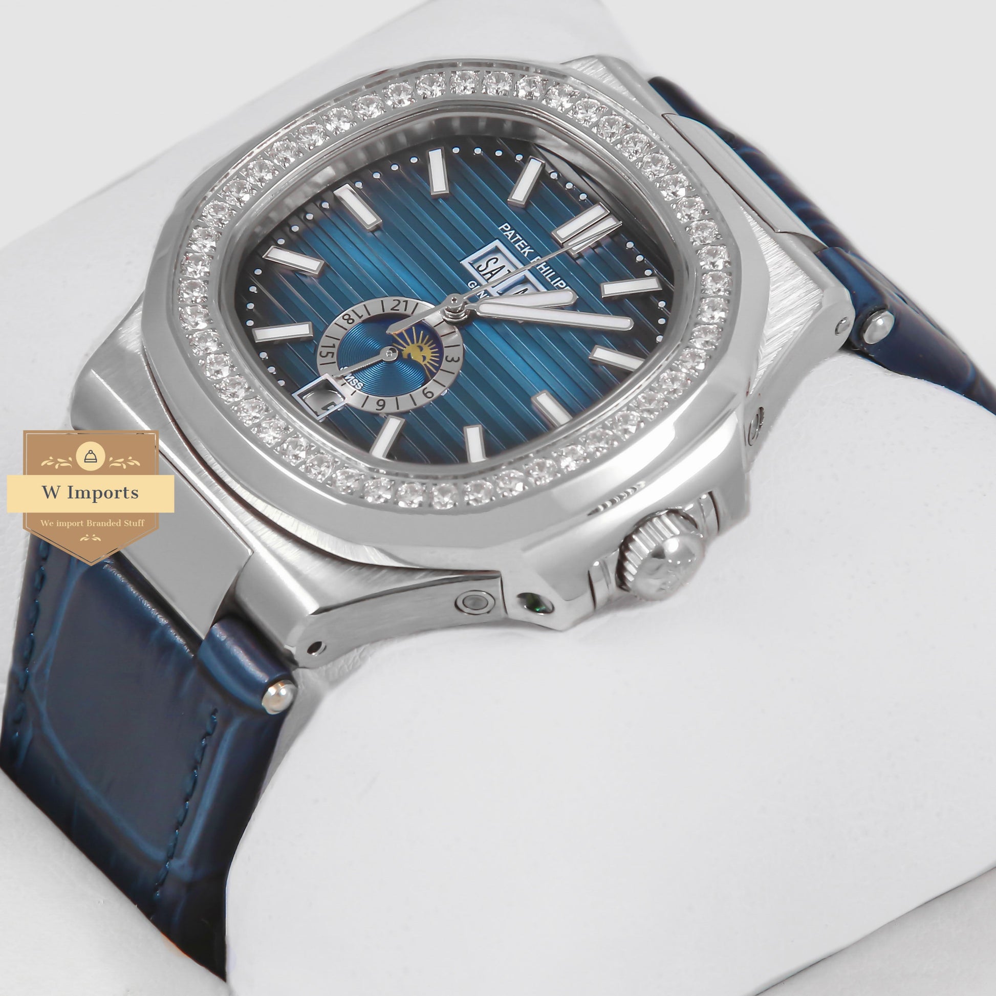 Latest Collection Annual Calendar Moon Phase Silver Stone Case With Blue Dial & Leather Strap