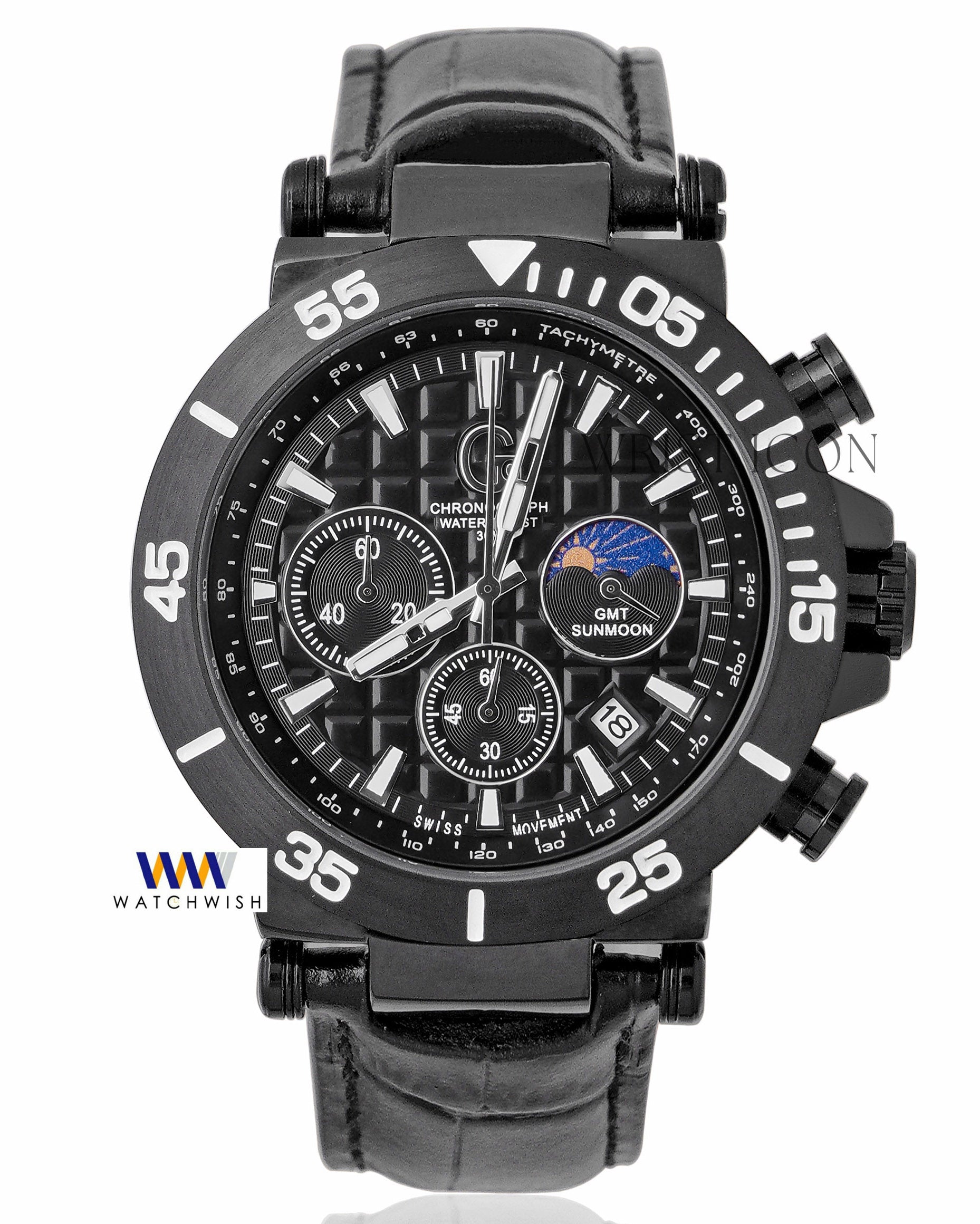 Latest Collection Chronograph Black Case With Black Dial & Leather Strap