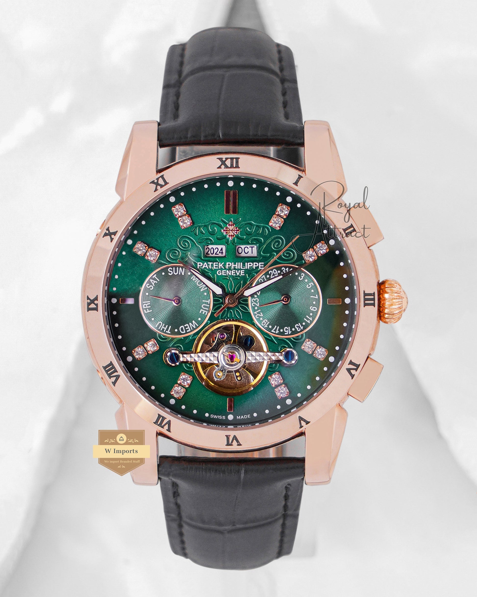 Latest Collection Chronograph Rose Gold Case With Green Dial & Leather Strap For Men