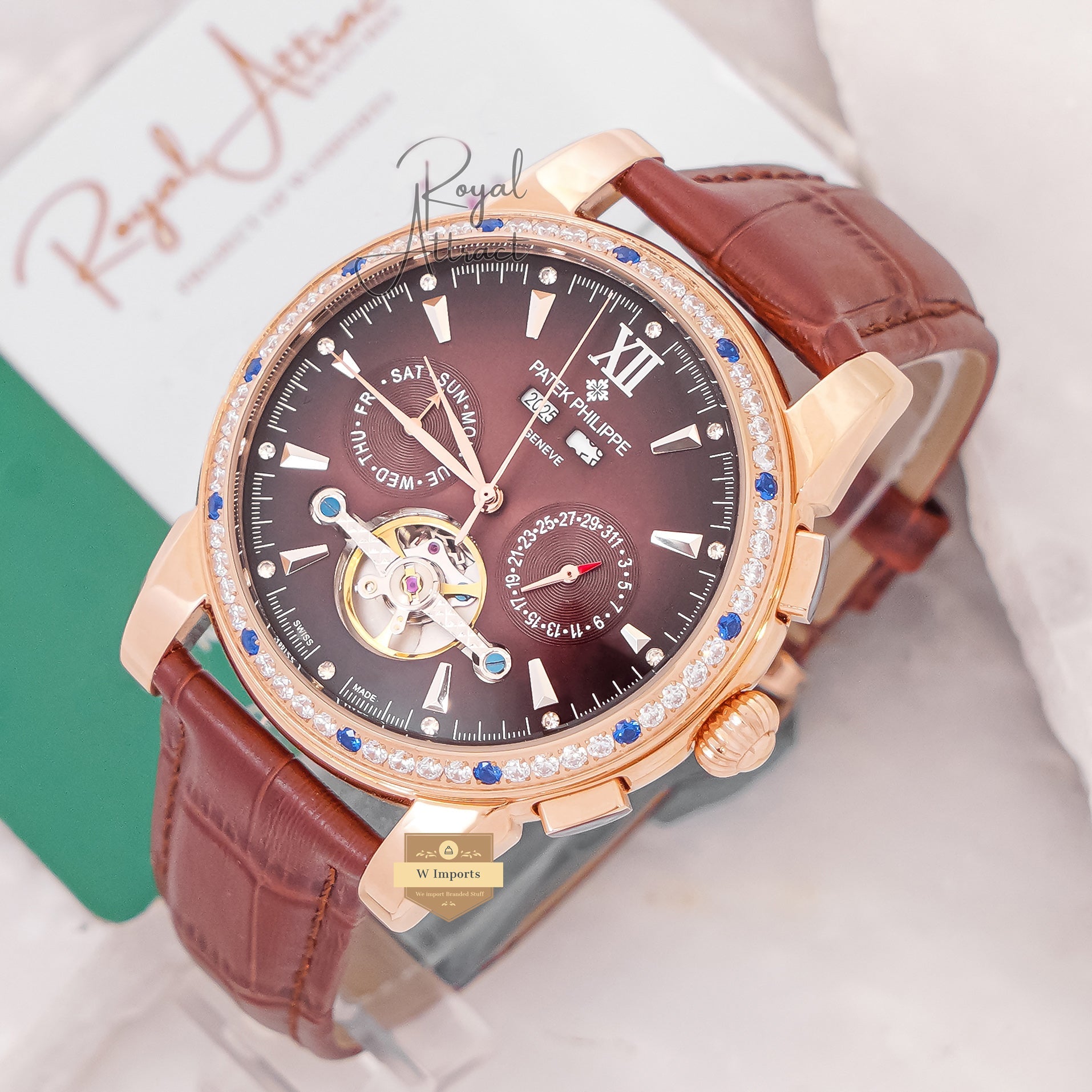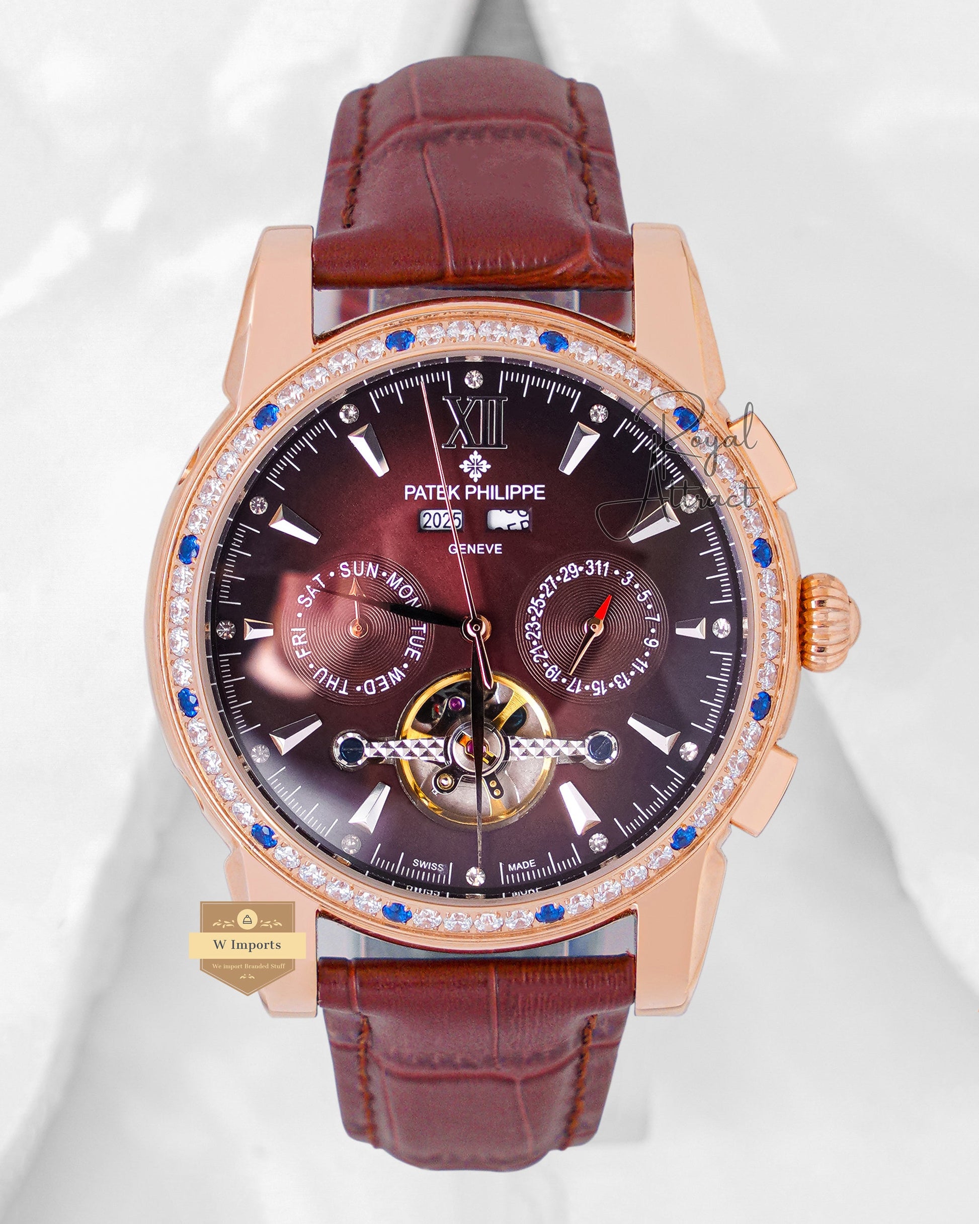Latest Collection Chronograph Rose Gold Stone Case With Brown Dial & Leather Strap For Men
