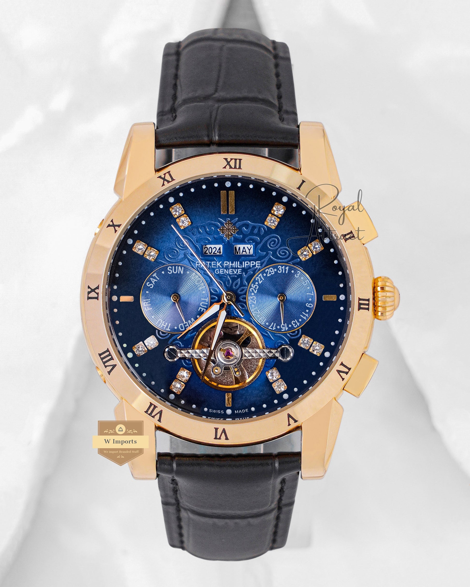 Latest Collection Chronograph Yellow Gold Case With Blue Dial & Leather Strap For Men