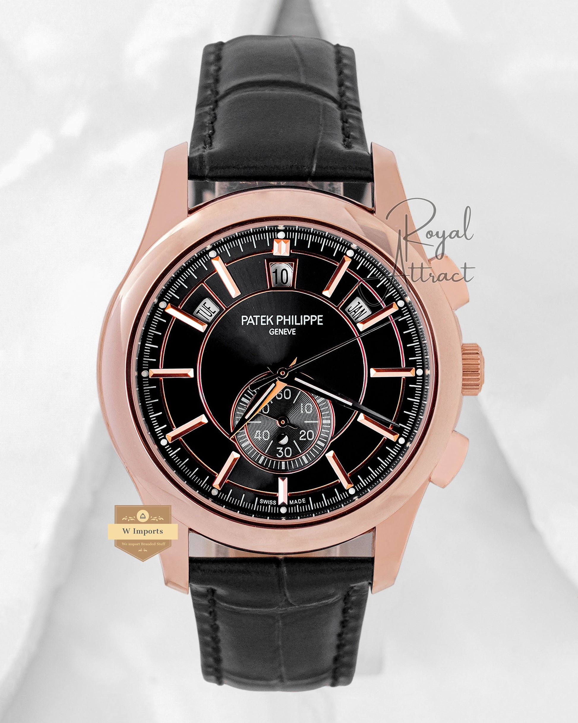 Latest Collection Moon Phase Rose Gold Case With Black Dial Dial & Leather Strap