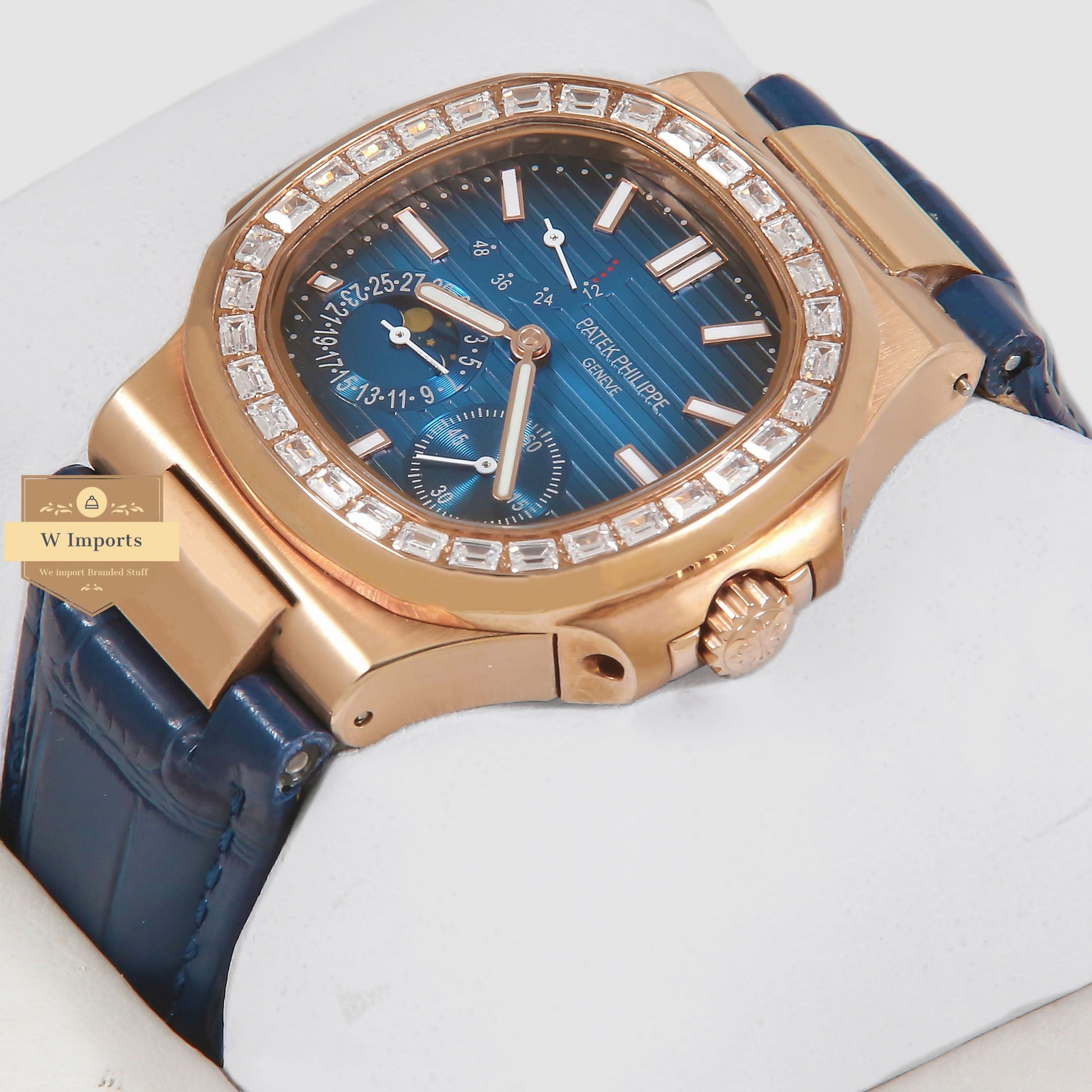 Latest Collection Rose Gold Case Stone Bezel With Blue Dial & Leather Strap