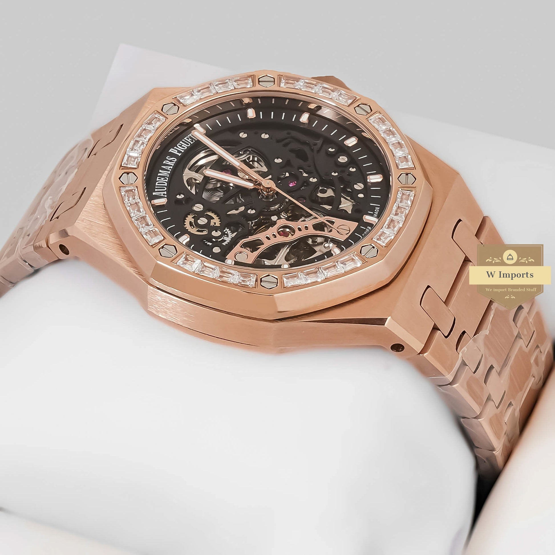 LATEST COLLECTION ROSE GOLD WITH BLACK SKELETON DIAL & STONE BEZEL