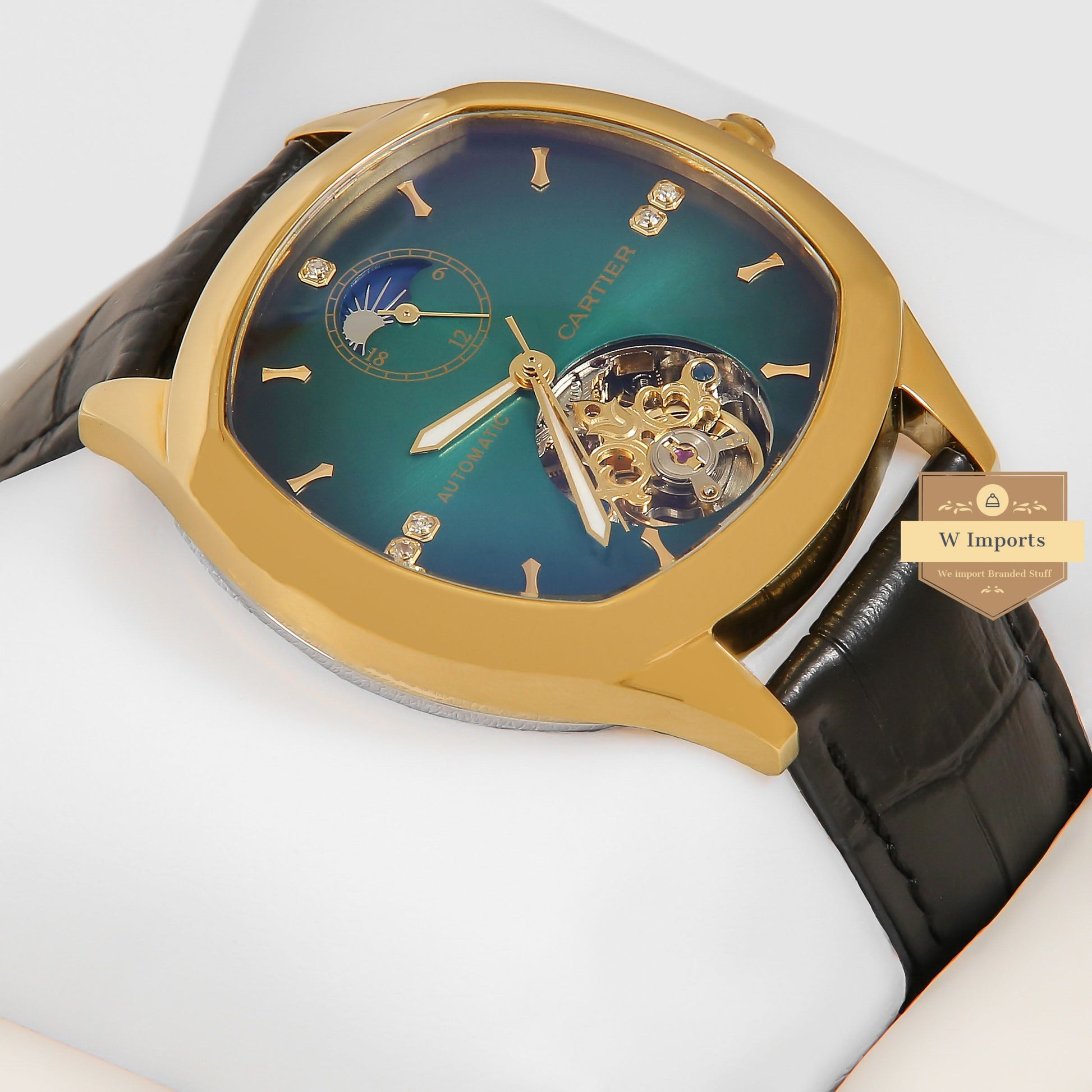 Latest Collection Tourbillon Yellow Gold Case With Green Dial & Black Leather Strap