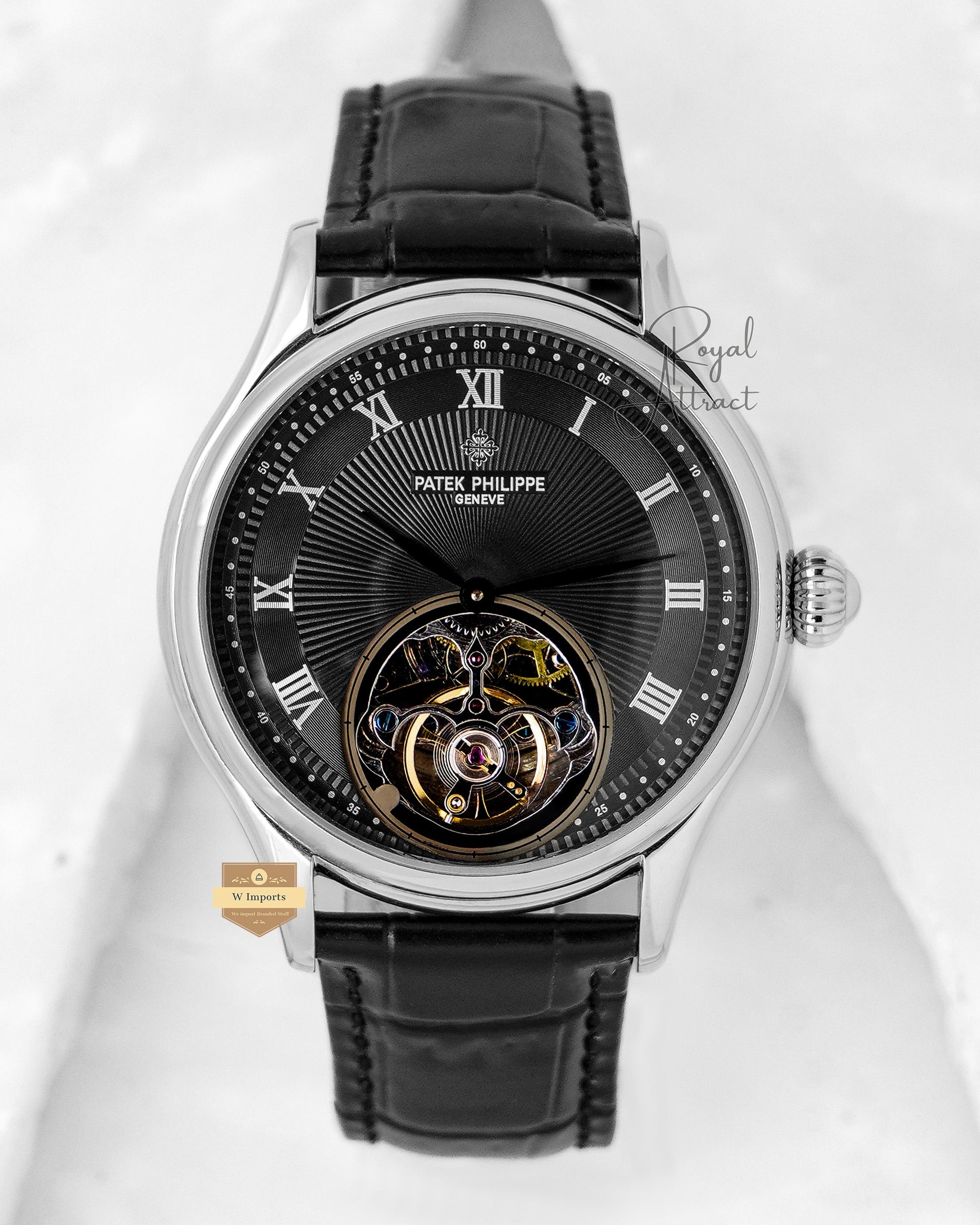 Latest Collection Tourbillon Silver Case With Roman Figure Black Dial & Leather Strap