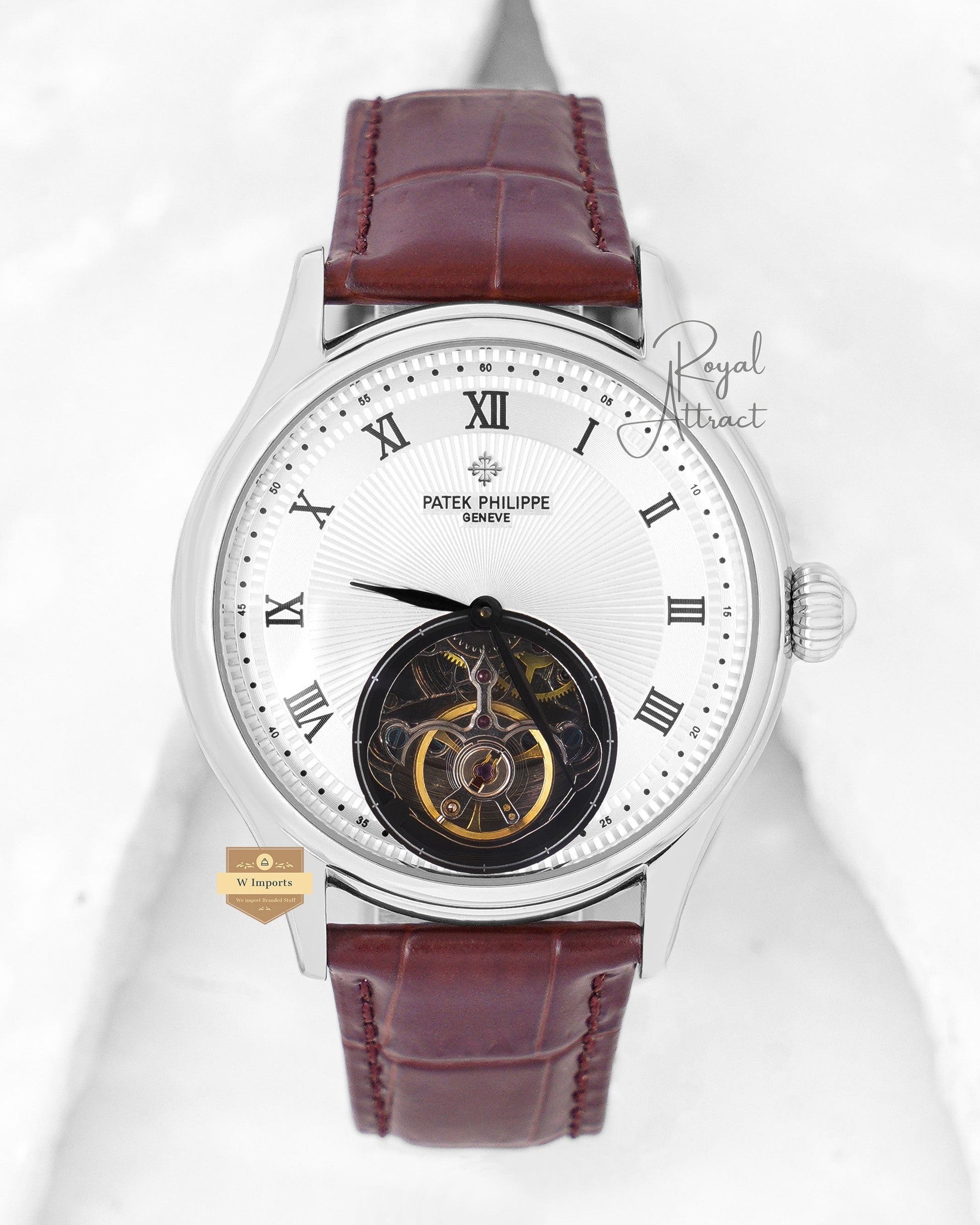 Latest Collection Tourbillon Silver Case With Roman Figure White Dial & Leather Strap